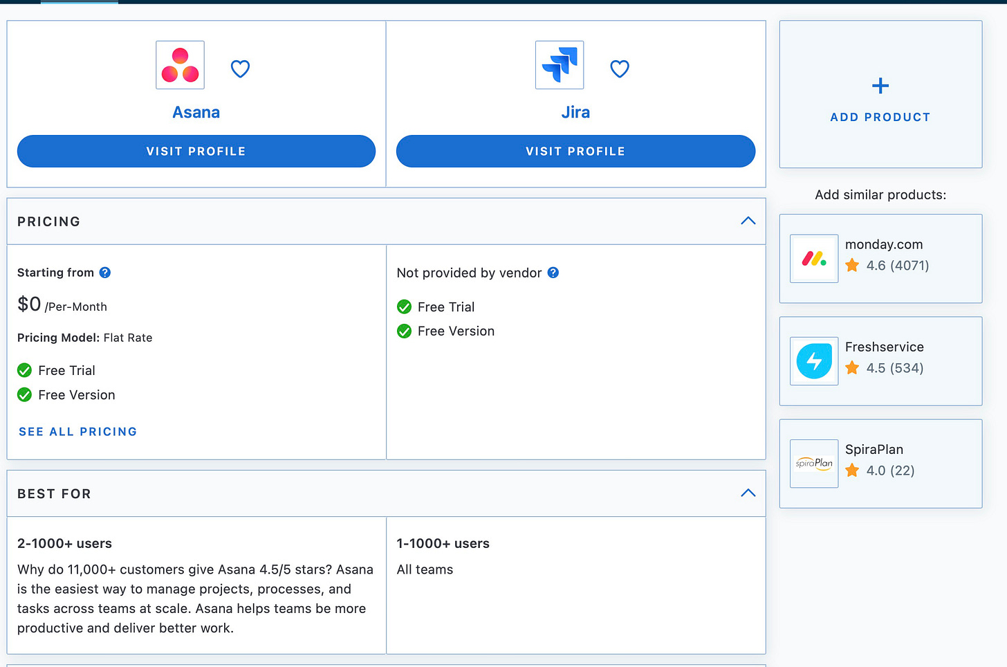 Is used in various fields and contexts. However, in product design, I prefer to focus primarily on the business aspect. It allows us to understand our competition, the market share they cover, their business model, as well as their strengths and opportunities (for us). A widely used tool for this is Capterra, but also you can find sourceforge, g2. By specifying the companies to compare, we can analyze all the information it provides.