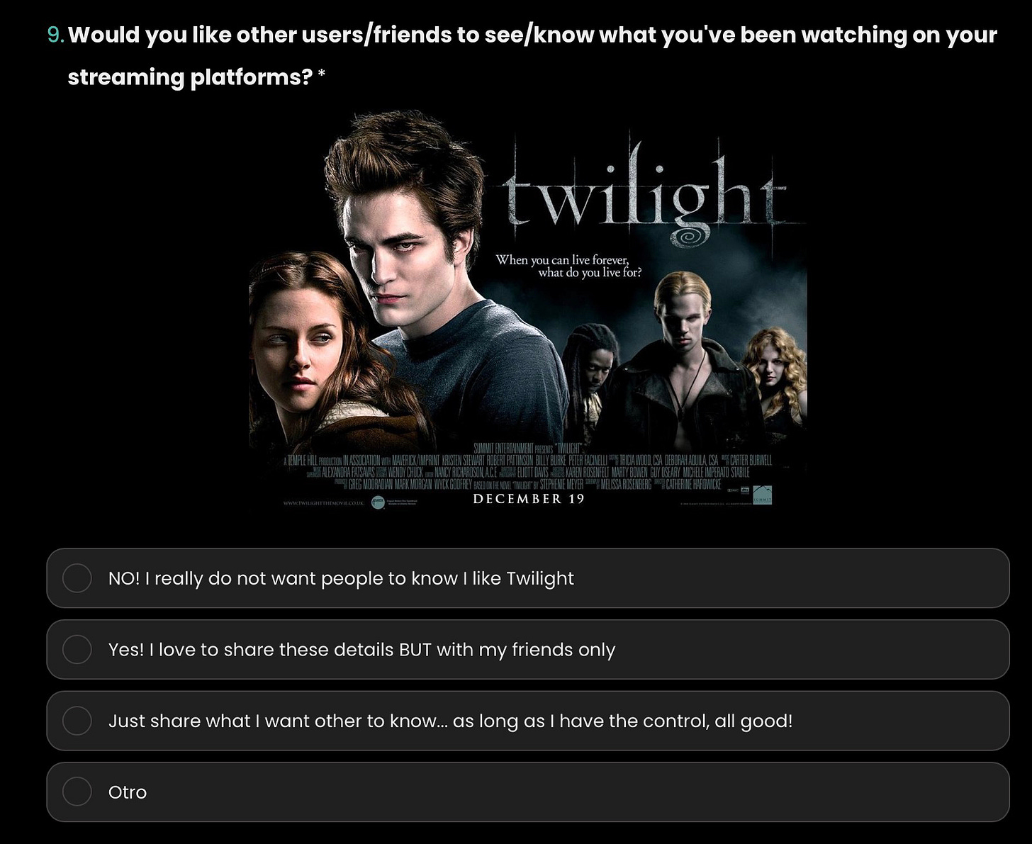 C’mon, It’s not necessary about twilight, the really intention behind the question if you feel confortable to share the content you watch, incluiding that thing that everybody hate but you like on secret